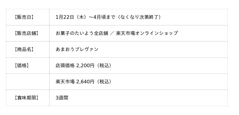 株式会社太陽社(所在地:千葉県匝瑳市飯倉293、代表取締役:片岡正裕)が展開する、千葉県で長年愛され続ける菓子店「お菓子のたいよう」は、千葉県産米粉100%の重厚なバウムクーヘンに、福岡県産あまおう苺を贅沢に重ねた、冬・春限定商品「あまおうブレヴァン」を、1月22日(木)より販売いたします。「グルテンフリーだから」という妥協を、完全に過去にする。素材の力でここまでおいしく仕上げた、驚きのグルテンフリースイーツです。「これがグルテンフリー?」と思わず声が出る、濃厚で食べ応えのあるハードタイプのバウムクーヘンに仕上げました。