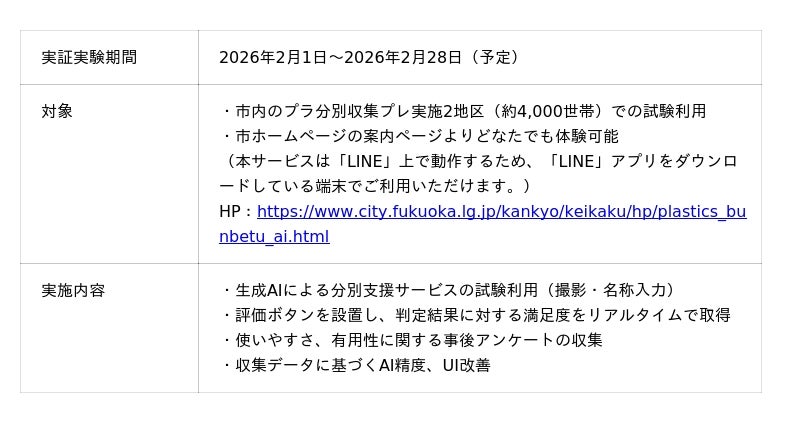 LINEヤフーコミュニケーションズ株式会社(本社:福岡市博多区、以下当社)は、 福岡市との公民共働事業として、同市で2027年2月より開始予定のプラスチック分別収集に先立ち、市民の分別の迷いを軽減することを目的に、コミュニケーションアプリ「LINE」を活用した生成AIによるごみ分別支援サービスの実証実験を実施しています。