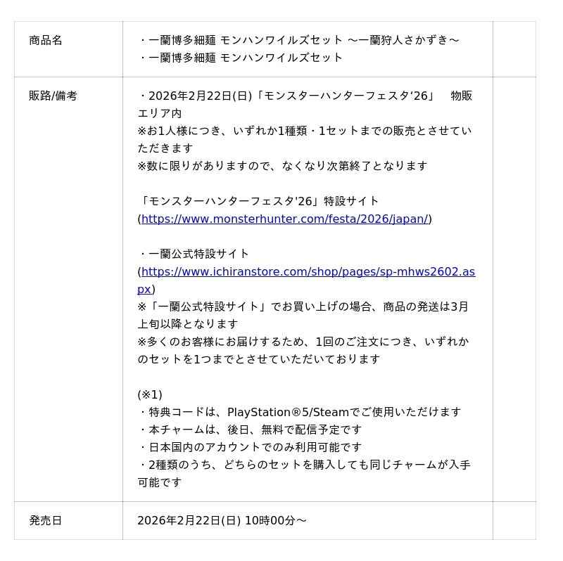 2026年2月22日開催の「モンスターハンターフェスタ'26」に合わせて、『一蘭』と『モンスターハンターワイルズ』の世界観が融合したオリジナルグッズセットを発売決定!!