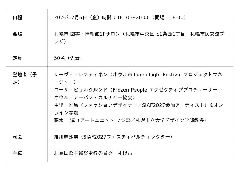 このたび札幌市は、ユネスコ創造都市ネットワークを活用したトークイベント「街と街のクリエイティブミーティング-創造都市のこれから」を開催します。札幌市と同じ「メディアアーツ都市」であるフィンランド・オウル市の関係者をスピーカーにお招きするとともに、札幌国際芸術祭(SIAF)2027参加アーティストも登場します。