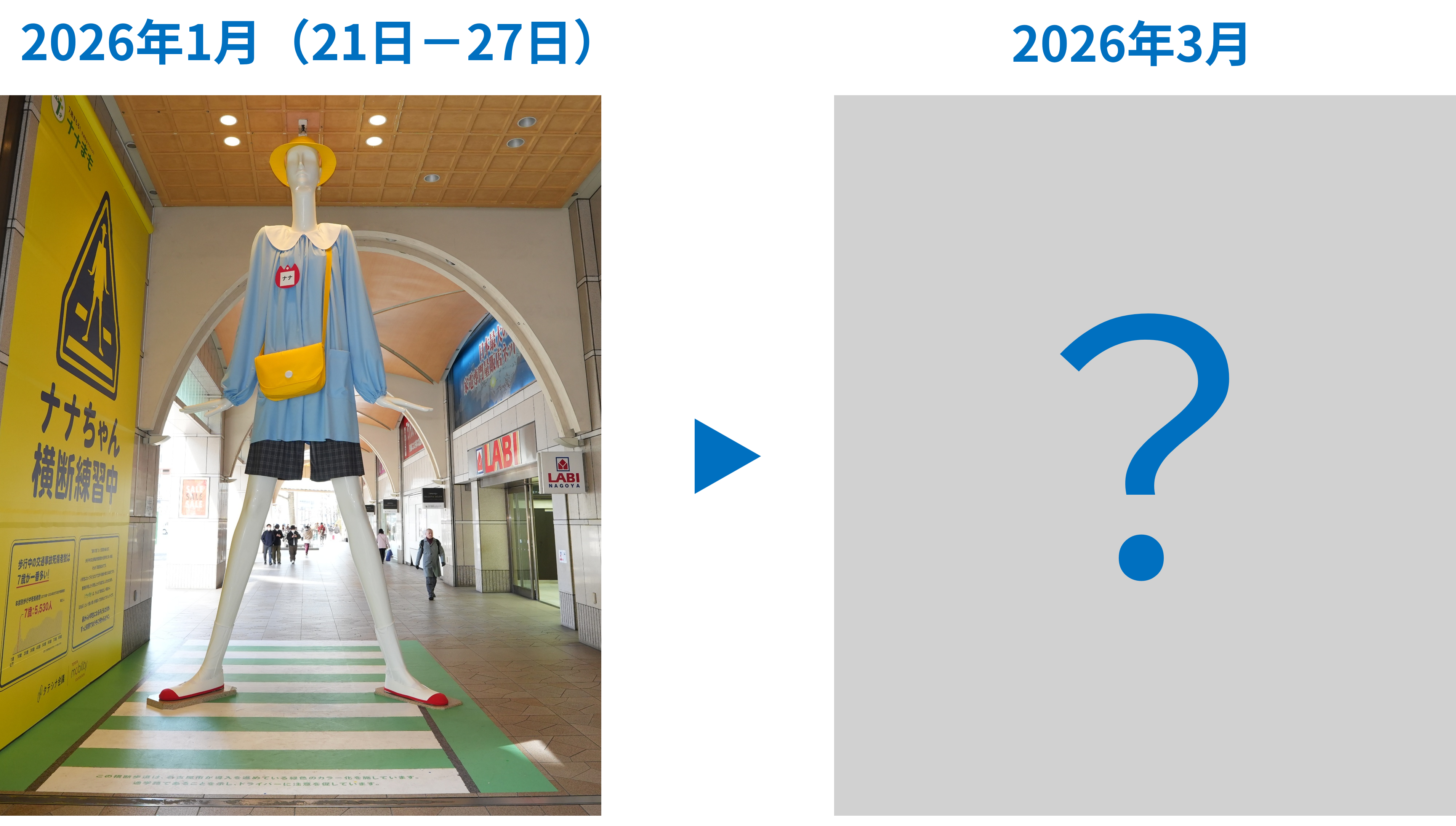 2026年1月21日(水)から1月27日(火)までの1週間、4月の入学前の備えを呼びかける目的で、ナナちゃん人形が「横断歩道を渡る練習をする園児姿」に変身します。