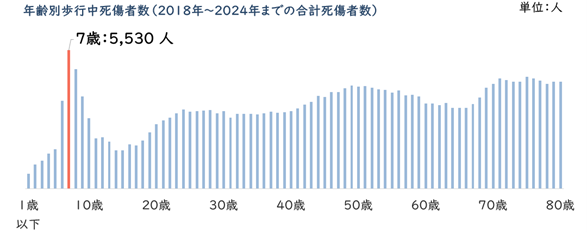 交通事故総合分析センター(ITARDA)のデータからの累計(2018-2024年)によると、歩行中の事故死傷者数が最も多い年齢が「7歳」となっており、小学3年生頃に該当する9歳頃までの事故死傷者数が突出しています。