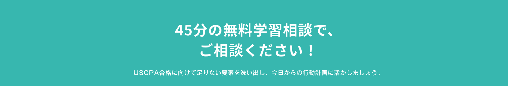 A:無料学習相談では、現在の学習状況や悩みを整理し、USCPA合格に向けて「今、何を優先すべきか」を一緒に言語化します。ポリシーとして、無理な勧誘や営業は行っていません。強引な営業の先の受動的な伴走に、"自走"はないと思っています。受講することもしないことも、ご自身で決断していただければと思います。