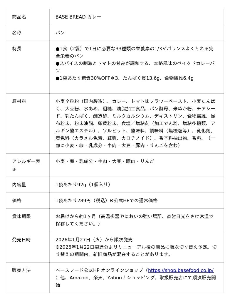 完全栄養の主食※1等を開発・販売するベースフード株式会社(本社:東京都目黒区、代表取締役:橋本舜、https://basefood.co.jp)は、1食に必要な33種類の栄養素がすべてとれる全粒粉ベースの完全栄養のパン※2「BASE BREAD(ベースブレッド)」シリーズの内、「BASE BREAD カレー」を2026年1月27日(火)より公式オンラインショップ(https://shop.basefood.co.jp/)、他ECサイト、取扱販売店にて順次リニューアル販売します。