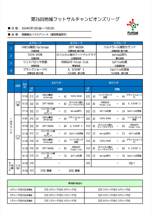【第26回地域フットサルチャンピオンズリーグ】組合せおよび試合スケジュール公開のお知らせ