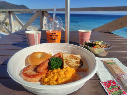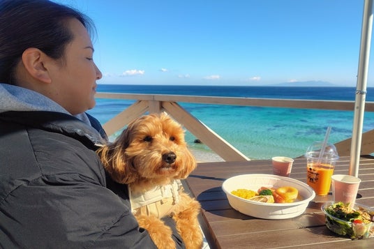 【オーシャンフロントテラスで朝食&ワンちゃんおやつタイム】ビーチクリーン体験後は、見渡す限りの海が広がる絶景を楽しめるテラス「オーシャンフロントテラス」での朝食タイムです。希望時間に合わせてホテル内のカフェ「Two Tails' cafe」にて用意した朝食をテイクアウトして、ワンちゃんと一緒に食べることができます。ワンちゃんにも飼い主様の朝食タイムに合わせておやつを提供します。