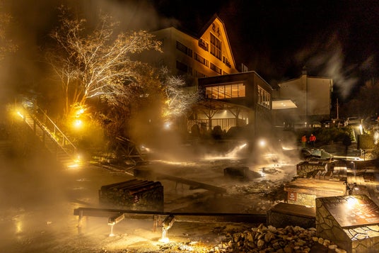 「川湯 岩盤テラス」の夜はライトアップで幻想的な空間