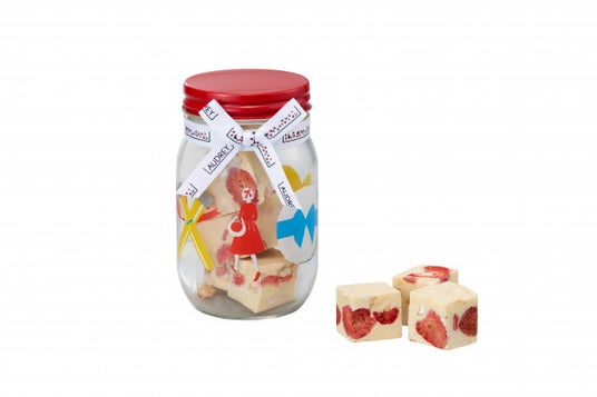 九州産の苺をまるごとフリーズドライにして、ホワイトチョコレートを浸み込ませました。見た目は苺、口に含むとチョコレートです。