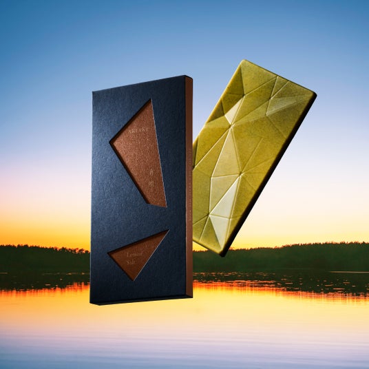 空の情景を閉じ込めた、移りゆく夜景色を表現したチョコレート「有明」。Yoru-iro ARIAKEはインドネシア産カカオのチョコレートに青レモンの酸味と苦みを合わせ、まろやかな味わいのソルトを効かせた商品です。「糸島レモン」の青レモンを自社でパウダー加工し、「またいちの塩」と合わせて使用しています。