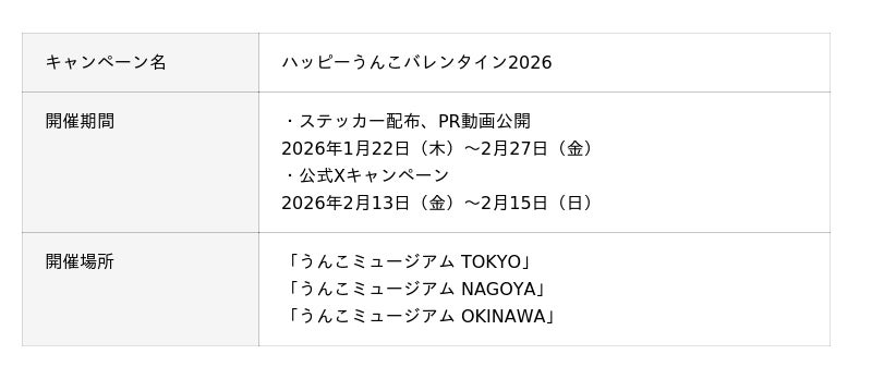株式会社カヤック(本社:神奈川県鎌倉市、代表取締役CEO:柳澤大輔、東証グロース:3904、以下「面白法人カヤック」)は、株式会社たのしいミュージアム(本社:東京都渋谷区、代表取締役:小林将)と共同で事業を展開する体験型エンターテインメント施設「うんこミュージアム OKINAWA」にて、初となるバレンタインキャンペーン『ハッピーうんこバレンタイン2026』を、2026年1月22日(木)から2月27日(金)まで実施します。なお、本キャンペーンは「うんこミュージアム TOKYO」「うんこミュージアム NAGOYA」でも同時開催いたします。