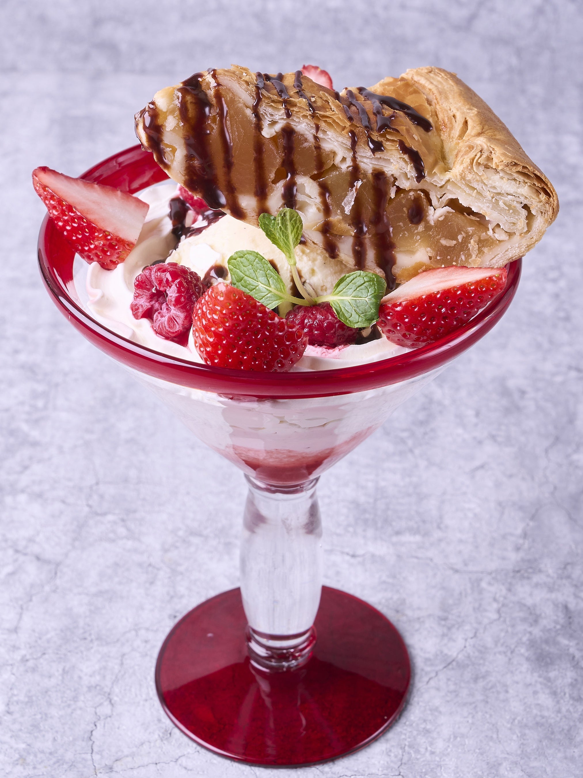 また、デザートカテゴリーからは「アップルパイ&ベリーパフェ」をご用意。ストロベリームースをベースにしたアイスクリームパフェに、彩り華やかなイチゴとフランボワーズに加え、温かいアップルパイを大胆にトッピングしました。ビジュアル、ボリュームともに迫力の"ひやあつ"デザート、カップル、ファミリーでシェアしてお楽しみいただくのもおすすめです。