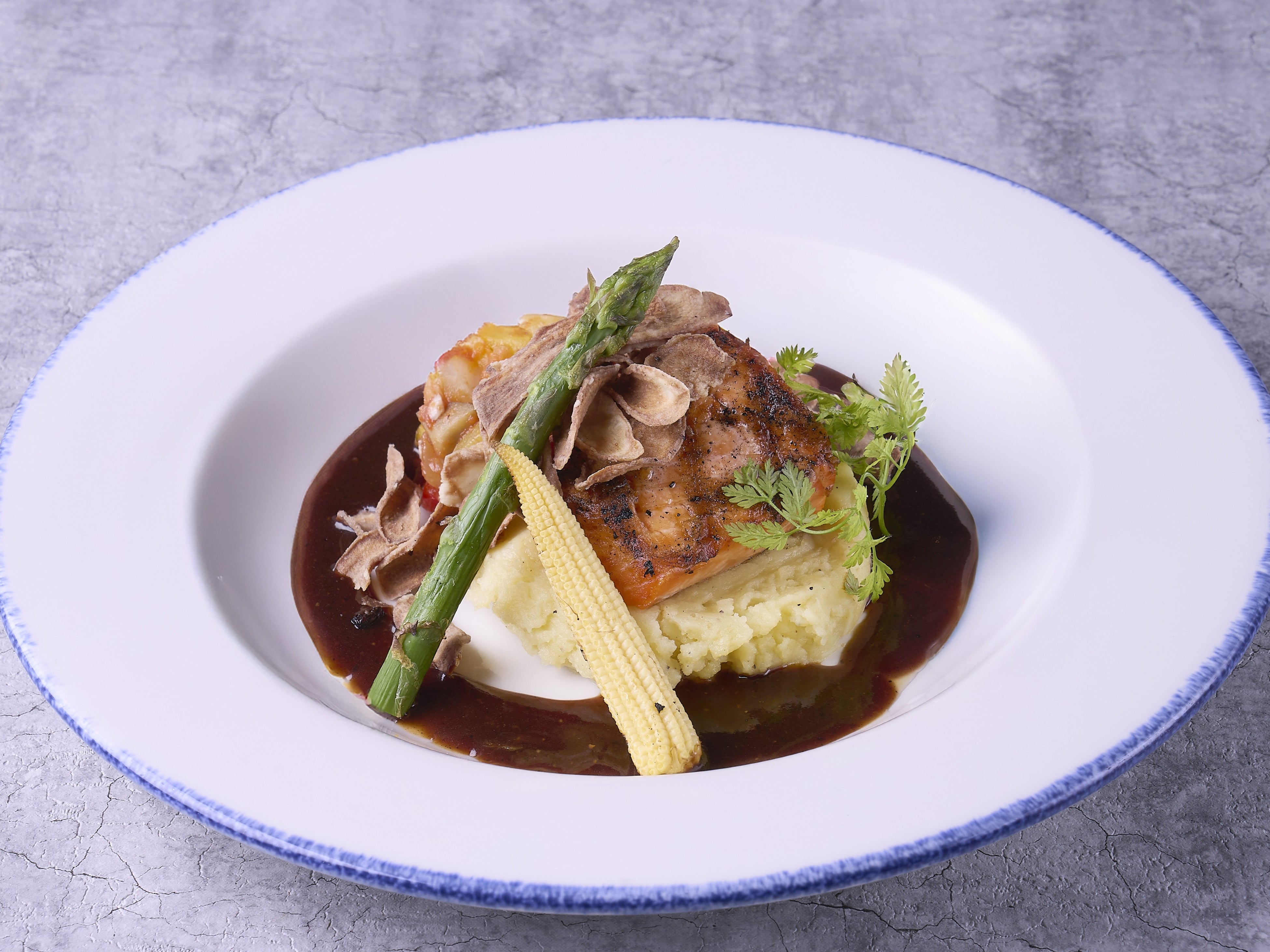 「メープルバーボンBBQサーモン」は、ちょっぴり甘辛な特製メープルバーボンBBQソースで味わうサーモングリルに、アスパラやヤングコーンなどの春野菜を添えたメインディッシュ。お取り分けいただき、トニーローマの看板メニューであるバーベキューリブとセットで味わうのおすすめの、バランス感絶妙なボリュームも魅力です。