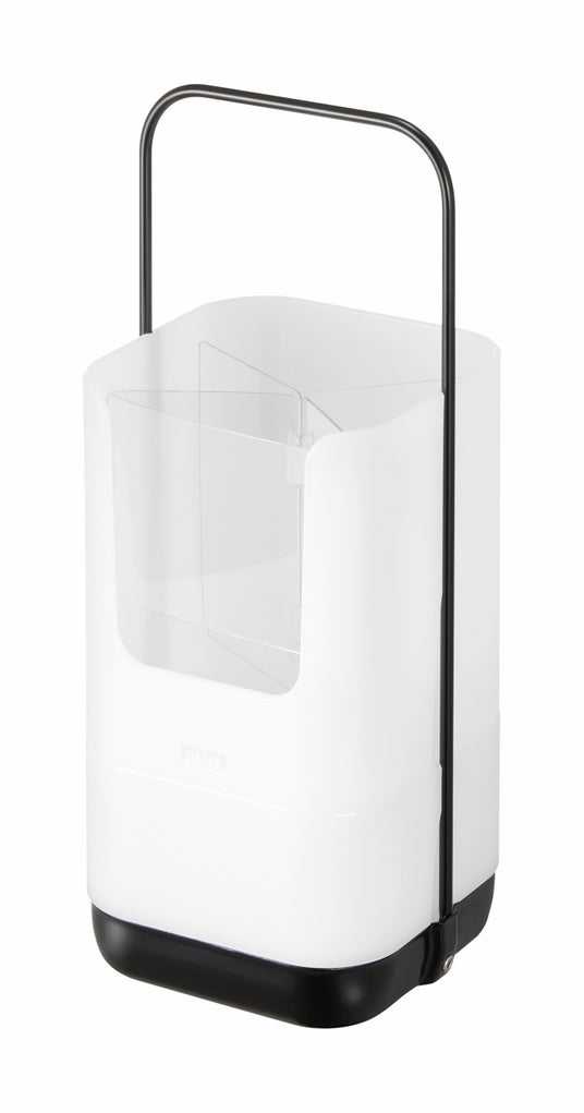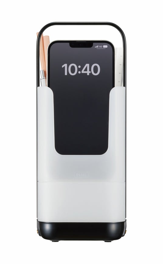 防災意識が高まるなか、本製品は普段使用しているものを非常時にも役立てる「フェーズフリー」の発想に基づき企画されました。日常時にはデスクワークを快適にする多収納型ペンスタンド。筆記具や定規、はさみなど長さのある道具に加え、付箋や消しゴムなどの小物類が入るトレーを備えています。スマートフォンスタンド機能も搭載し、机上をすっきり整理できます。さらに、停電や避難生活などの非常時には、スマートフォンや懐中電灯を入れることで光をやさしく拡散し、ランタンとして活用可能です。また、持ち手付きのため、フリーアドレスなどオフィス内での移動や、ランタンとして使う際にも明かりを運べるので便利です。