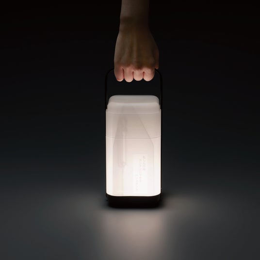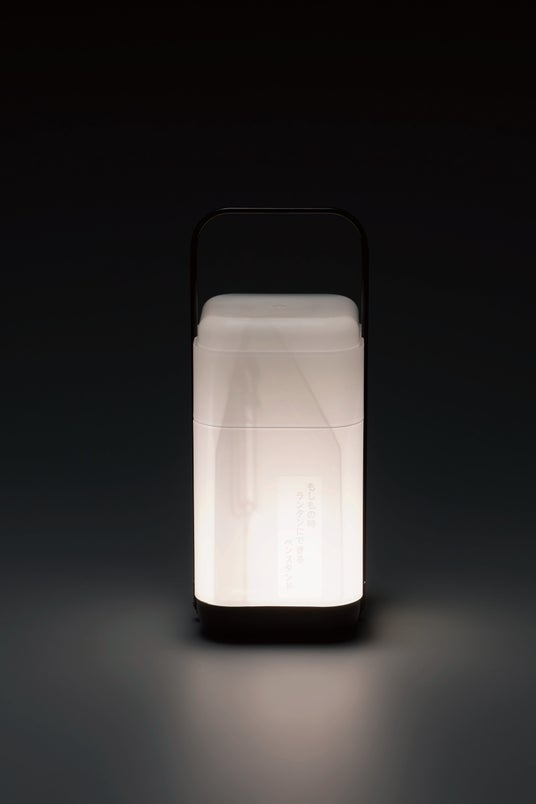 乳白色のケースには光拡散材を配合しており、光を優しく和らげます。さらに、避難所など周囲への配慮が必要な場面では、小物トレーを取り出して、上から蓋をすることで全体を覆い、光源をすべてカバーすることも可能です。火を使わず安心・安全に周囲を照らし、持ち運びもできるため、非常時の心強い存在となります。