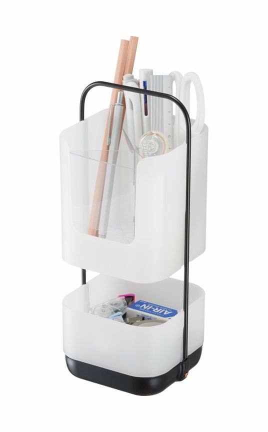 ペンスタンドとして利用する際は、2つのケースに分けてたっぷり収納することができます。筆記具や定規、はさみなどの長い道具を立てて入れる上部スタンド部分は仕切り付きで、仕分け・整理に便利。付箋や消しゴムなどは小物トレーにきれいに収まります。机上をすっきり整え、効率的な作業環境を実現します。