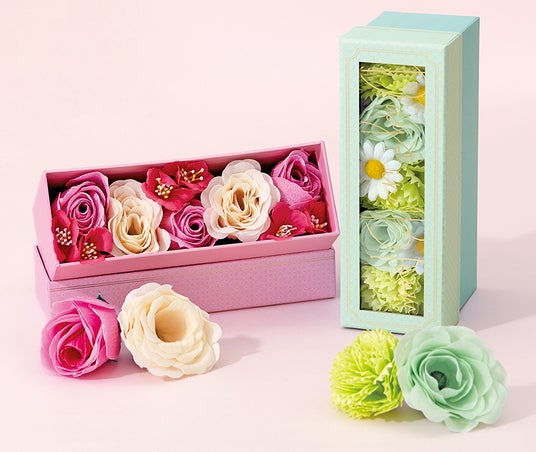 芳潤な花のアロマ香るバスフラワーをボックスに詰めた華やかバスギフト。湯船に入れてお湯を注げばモコモコ泡風呂に。使用するまで飾って、インテリアとしても楽しめます。