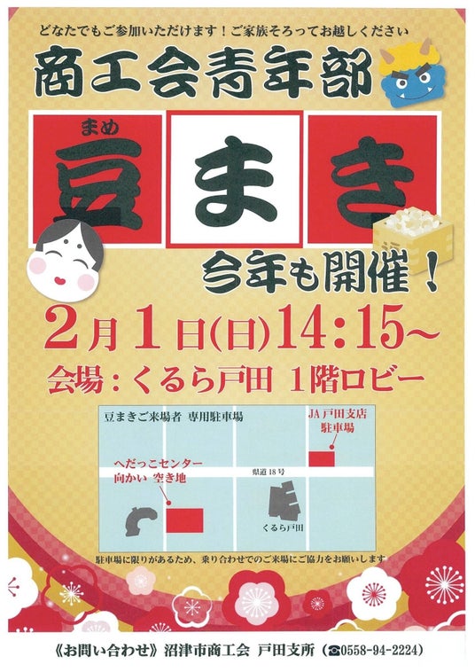 当日は、道の駅くるら戸田 2階吹き抜けより、沼津市商工会戸田支所青年部による豆まきを実施します。