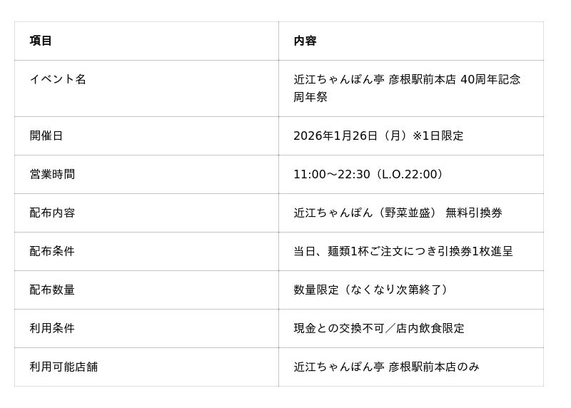 「近江のちゃんぽんをニッポンのちゃんぽんに!」を掲げるドリームフーズ株式会社(本社:滋賀県彦根市/代表取締役社長:山本英柱)は、近江ちゃんぽん亭 彦根駅前本店(滋賀県彦根市旭町)が創業40周年を迎えることを記念し、2026年1月26日(月)に「40周年記念 周年祭」を開催いたします。