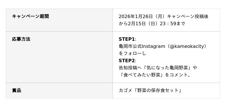亀岡市公式Instagramでのプレゼントキャンペーンでは、フォロー&コメントの簡単なステップで、カゴメ「野菜の保存食セット」を抽選で35名様に進呈します。