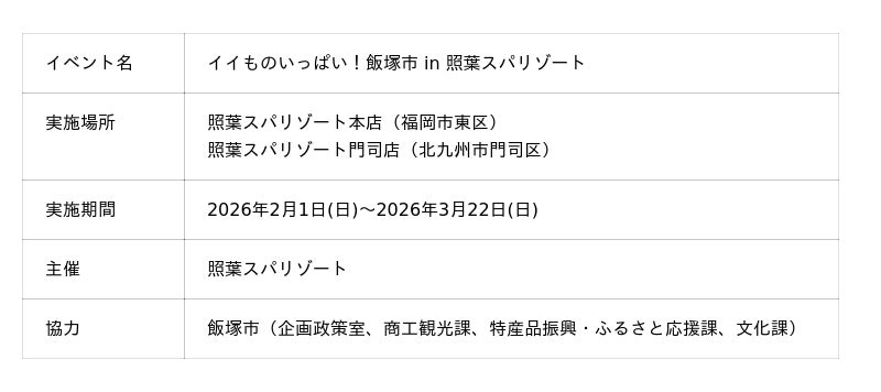 株式会社ナカシロが運営する温浴複合施設「照葉スパリゾート本店」(福岡市)および「照葉スパリゾート門司店」(北九州市)は、飯塚市の魅力発信を支援する取り組みとして、コラボレーション企画「イイものいっぱい!飯塚市 in 照葉スパリゾート」を、2026年2月1日(日)から3月22日(日)まで開催いたします。