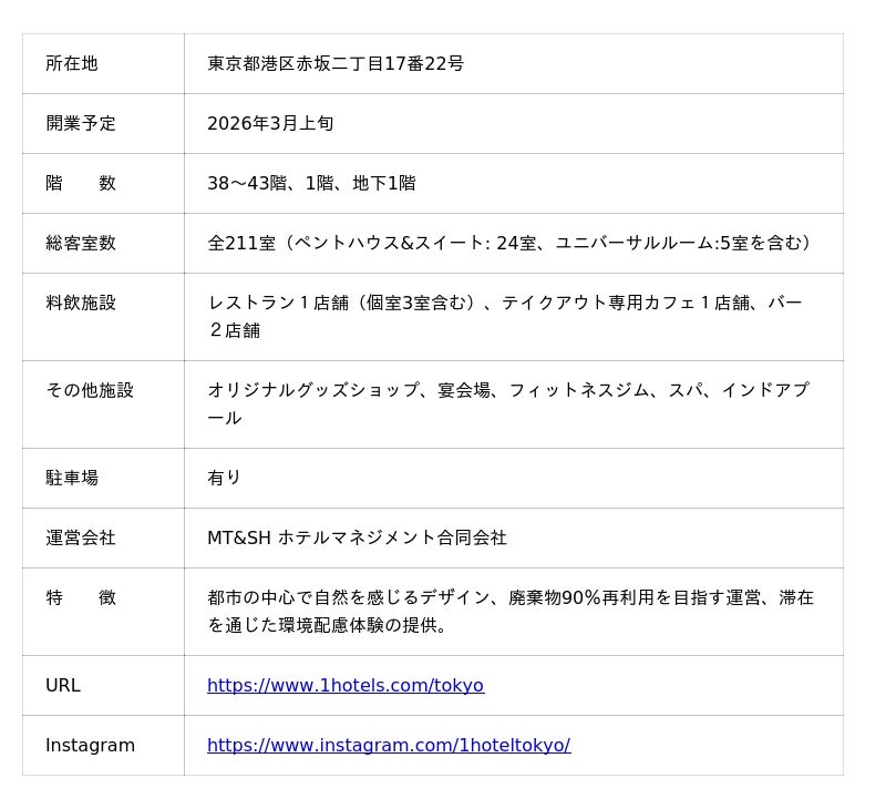 ホスピタリティ業界のビジョナリーとして知られるバリー・スタンリヒトが創設した、ミッション主導型のサステナブルラグジュアリーホテルブランド「1 Hotels」(読み:ワンホテルズ、本社:米国フロリダ州、CEO:ラウル・レアル)は、2026年3月上旬に開業予定の「1 Hotel Tokyo」(読み:ワンホテルトウキョウ、所在地:東京都港区赤坂 総支配人:小南 正仁)の宿泊予約の受付を開始したことをお知らせいたします。