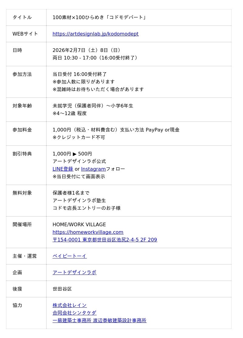 4歳からのクリエイティブスクール、アートデザインラボ(東京都世田谷区/運営:ベイビートーイ)は、体験型アートイベント「100素材×100ひらめき コドモデパート」を2026年2月7日(土)・8日(日)、HOME/WORK VILLAGE(世田谷区・池尻)にて開催します。