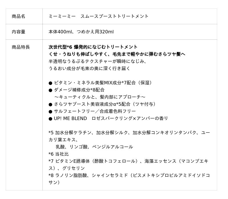 『ミーミーミー スムースブーストシャンプー』と『ミーミーミー スムースブーストトリートメント』は、くせ・うねりも伸ばしやすく、毛先まで軽やかに弾むさらツヤ髪へと導きます。