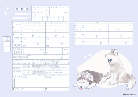 ふわっとした毛並みと、どこか優しい表情のハスキーが描かれた、見ているだけで心があたたまる婚姻届。 寄り添う姿からは、これからの日々を一緒に過ごすおふたりの穏やかな時間が感じられます。