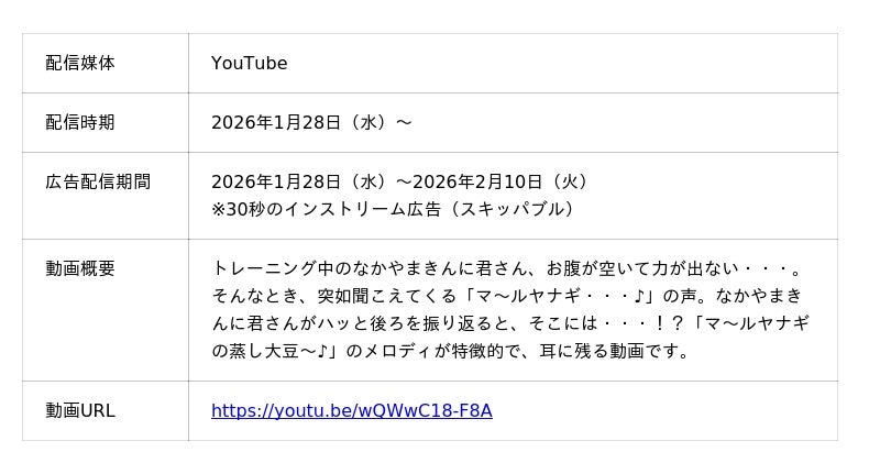 蒸し豆・佃煮・煮豆のマルヤナギブランドを展開する株式会社マルヤナギ小倉屋(神戸市東灘区 代表取締役社長:柳本勇治)は、2026年1月28日(水)より、YouTubeにて、なかやまきんに君さんが出演し、弊社キャラクター「マルヤナギくん」と一緒に「マ~ルヤナギの蒸し大豆♪」をユニゾン歌唱する動画を公開します。併せてYouTube広告にて同動画を2週間の期間限定で配信いたします。