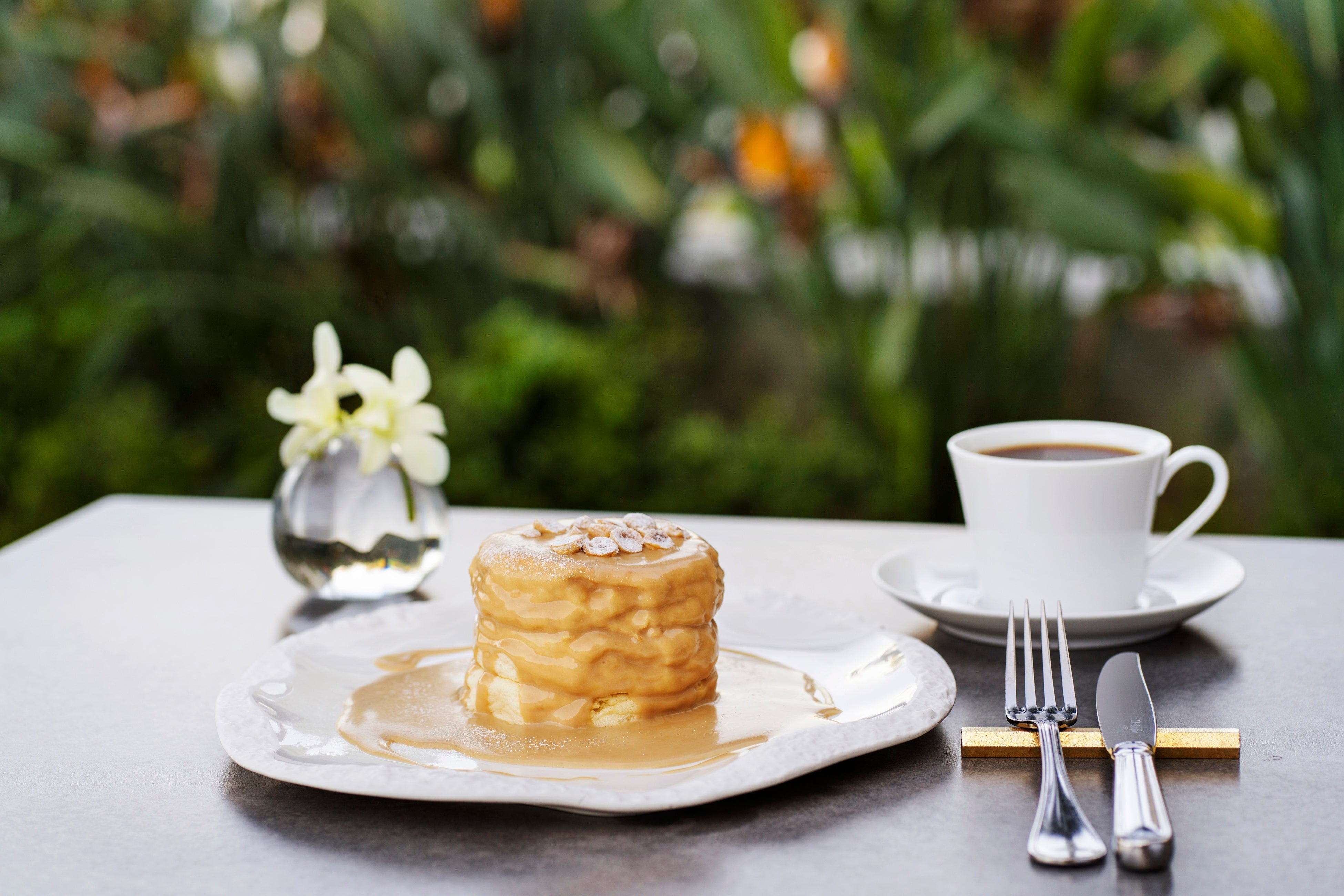当ホテルで不動の人気を誇る、スフレ仕立てのオリジナルパンケーキ。空気をたっぷり含んだふわふわの生地を贅沢に3段重ねにし、メイプルシロップとバターを贅沢に使用した濃厚なソースで仕上げました。口の中で軽やかに溶けるパンケーキに、香ばしくローストしたヘーゼルナッツのアクセントが絶妙に重なります。厳選したコーヒーや紅茶とのドリンクセットで、優雅なティータイムを心ゆくまでご堪能ください。