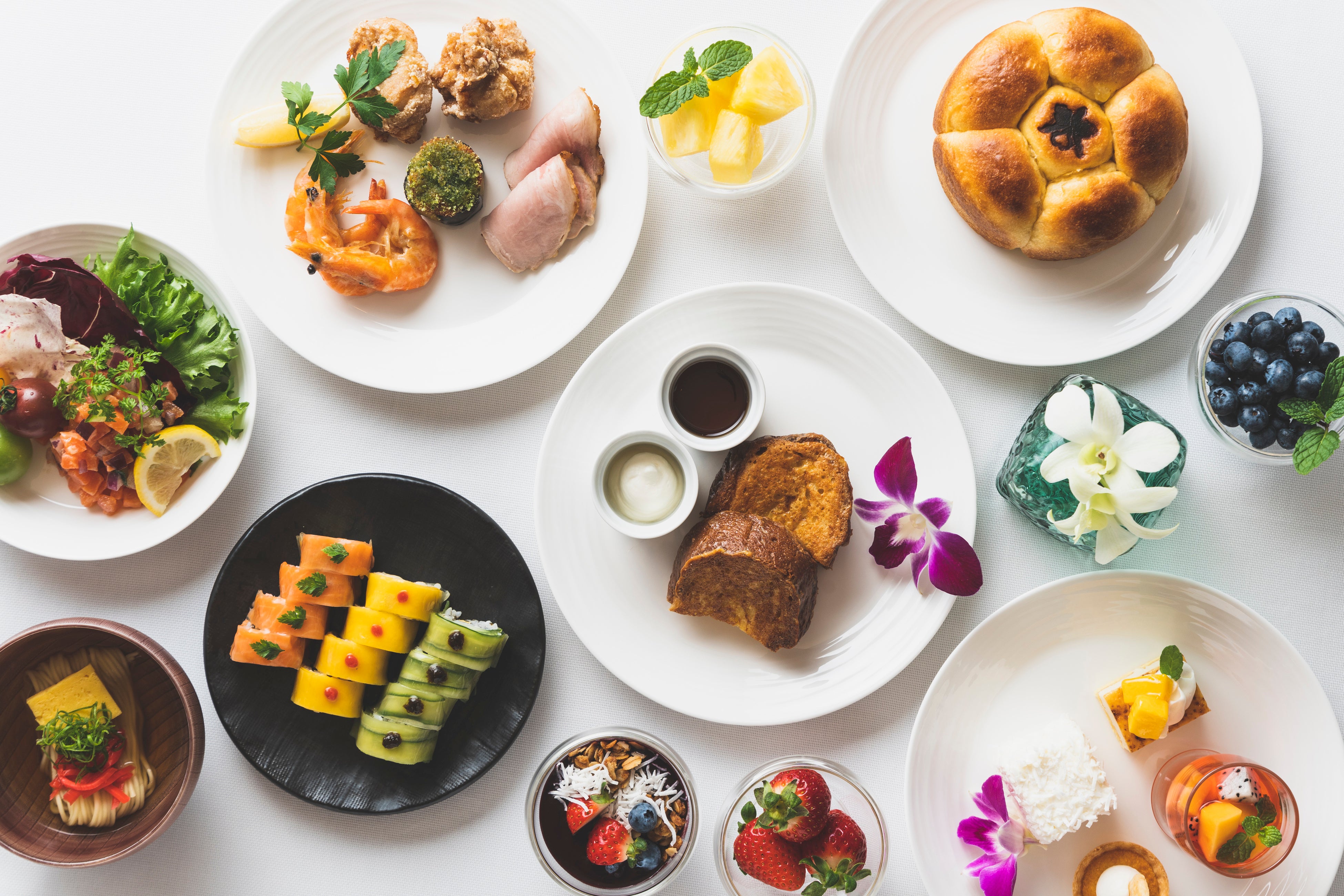 毎年多くのゲストを魅了する「ウィークエンドブランチ」を、本イベントに合わせて開催。南国のエッセンスをふんだんに取り入れた多彩なメニューを、開放感あふれるブッフェスタイルでご用意いたします。ハワイアンソルトで旨みを引き出し、丁寧に焼き上げた「骨付きあぐー豚ローストポーク」をはじめ、サイミンやハワイアンロールなど、シェフのこだわりの品々がラインナップ。ハワイの風を感じる空間で、週末を鮮やかに彩る特別なブランチタイムをお楽しみください。