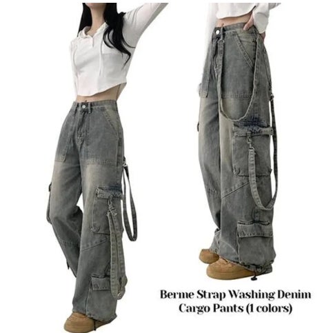 The Pink(ザ ピンク) / [Y2K/ジョガー可能] バーム ハイウエスト ストラップ ウォッシング デニム カーゴ パンツ