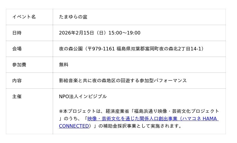 NPO法人インビジブル(福島県富岡町)は、影絵師・音楽家の川村亘平斎氏、同氏が主宰する音楽ユニット「滞空時間」、そして福島で生まれた「プロジェクトFUKUSHIMA!」とともに、影絵と音楽による参加型パフォーマンス《たまゆらの盆》を、2026年2月15日(日)に福島県双葉郡富岡町・夜の森公園にて開催します。