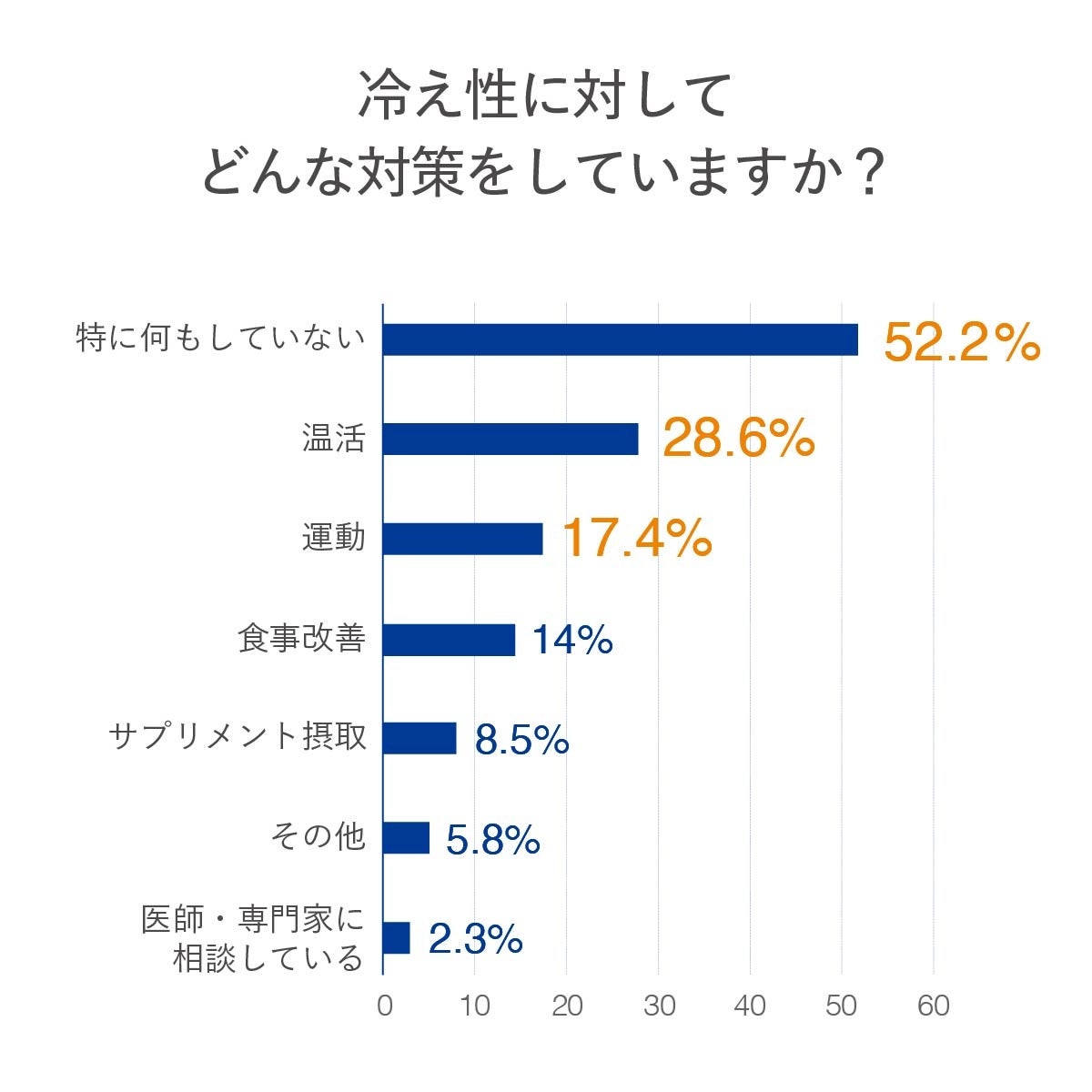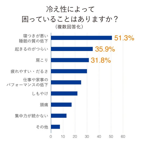 対策方法を聞いてみると、冷え性により睡眠の質の低下や疲労感など94.4%が生活への影響を実感している一方で、52.2%が「特に何もしていない」という結果に。生活に支障を感じながらも放置している人が過半数を占めています。