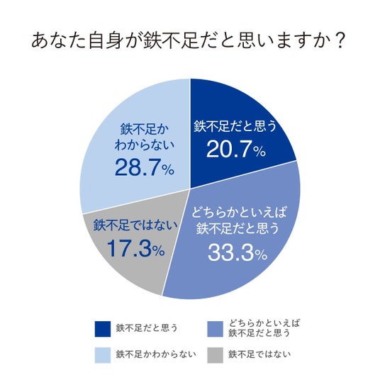 鉄は、ヘモグロビンの材料として全身に酸素を運ぶ役割を担っており、熱を作るエネルギー代謝を支えています。鉄が不足すると体温が上がりにくく、冷えを感じやすい身体になるため、鉄は冷え性改善の鍵となる栄養素です。■約2人に1人が鉄不足を自覚。しかし鉄分を意識して摂取している人はわずか2割という結果に