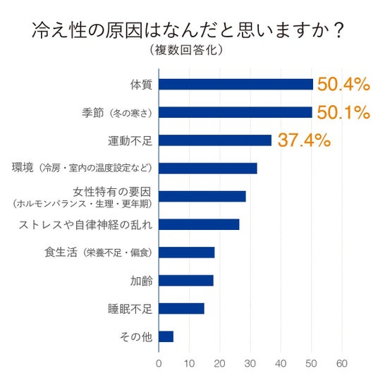 冷え性を放置すると、慢性的な疲労やメンタル不調、ムズムズ足症候群、記憶力・集中力の低下など、生活の質を下げる不調につながる可能性があると、橋本医師も指摘しています。■多くの人が冷え性の原因を「体質」「季節のせい」と回答。鉄不足との関連は約9割が知らず