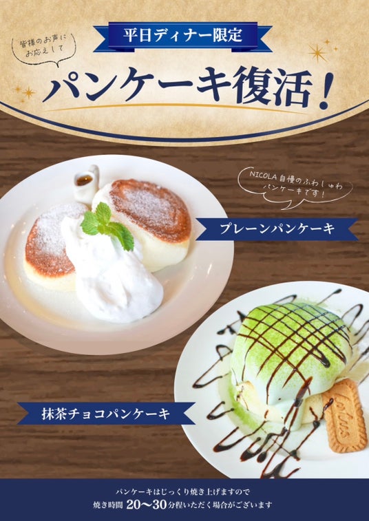 「また食べたい」の声が最も多かったデザートが復活。平日ディナー限定で楽しめるスフレパンケーキと、新お手軽ディナーコースを同時スタート。