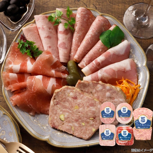 セット内容:パテ・ド・カンパーニュ70g、ベリーハム72g、ビアソーセージ90g、ポークソーセージ90g、肩ロース生ハム50g
