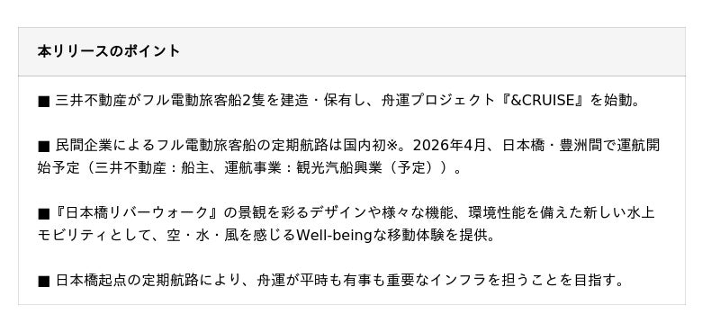 三井不動産株式会社(本社:東京都中央区 代表取締役社長:植田俊、以下「三井不動産」)は、舟運プロジェクト『&CRUISE』が始動することをお知らせいたします。フル電動旅客船の定期航路として、2026年4月、日本橋・豊洲間で運行を開始する予定です。