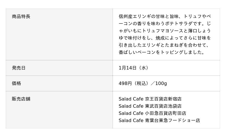 【サラダショップ|Salad Cafe】ポテトサラダのラインナップを強化~信州産エリンギを使ったトリュフ風味の新商品が登場!人気の3商品もさらに美味しくリニューアル~