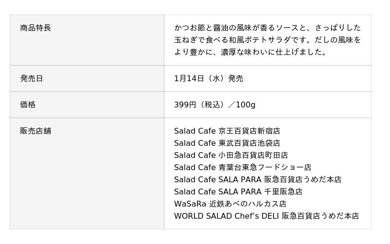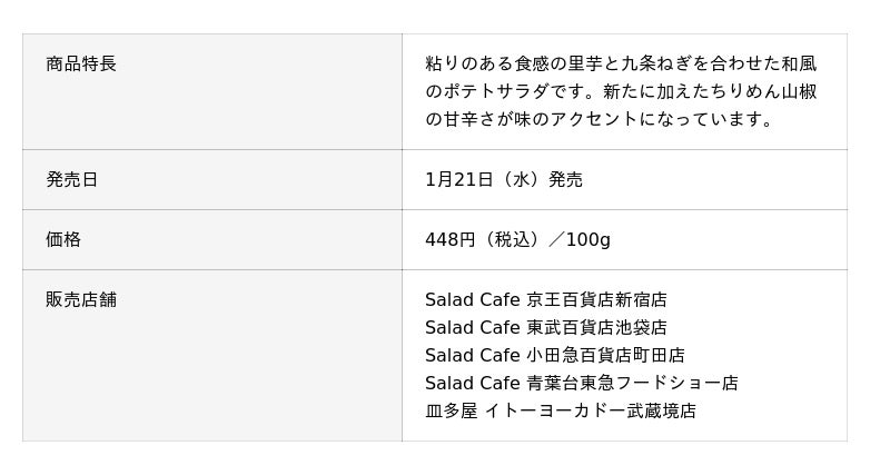 サラダカフェ株式会社は、ポテトサラダの商品ラインナップを拡充し、新商品1品とリニューアル商品3品の計4商品を、関西・関東で展開するサラダショップにて1月中旬より発売しましたのでお知らせします。