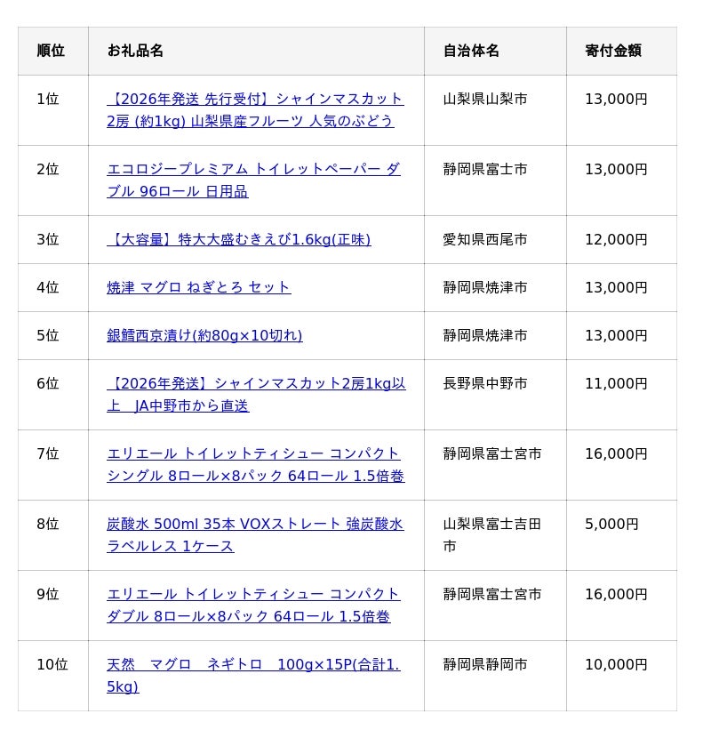 そのほか、「むきえび」「マグロ」「銀鱈」といった、ふるさと納税のお礼品として根強い支持を集める「魚介・海産物」が4品ランクインしました。一方で、「トイレットペーパー」や「炭酸水」といった「日用品」も4品ランクインし、お礼品として日常の消耗品を選ぶ傾向もうかがえます。