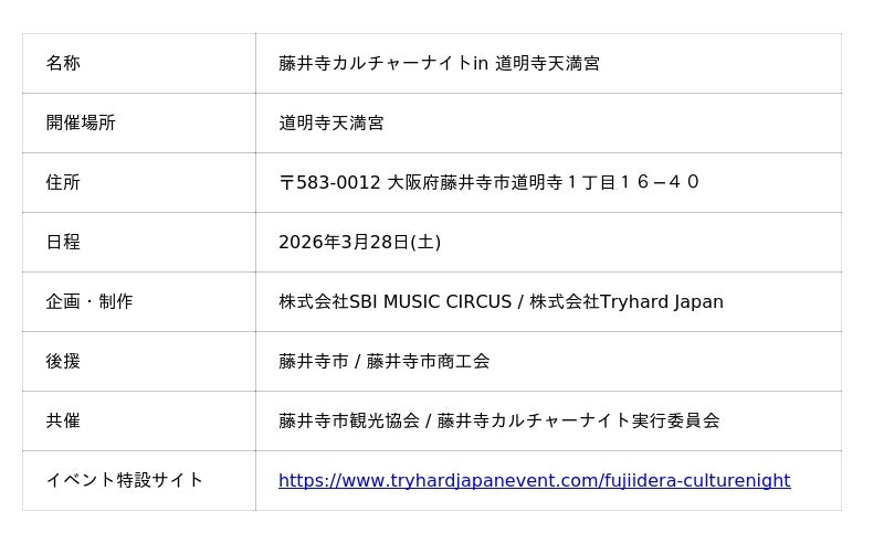 株式会社SBI MUSIC CIRCUS、(本社:東京都港区、代表取締役社長:大付 楽洋、以下「当社」)は、藤井寺市観光協会および藤井寺カルチャーナイト実行委員会とともに、2026年3月28日(土)、大阪府藤井寺市の歴史的文化資源である道明寺天満宮にて、「藤井寺カルチャーナイト in 道明寺天満宮」を初開催いたします。
