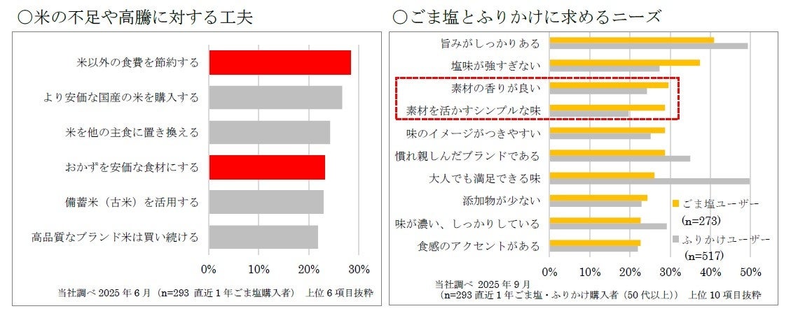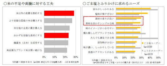 ・米の価格高騰下におけるごましおへのニーズ米の不足や価格高騰に対して、「米以外の食費を節約する」「おかずを安価な食材にする」といった工夫をしている方がいることがわかります。手軽に米食の満足度を高めることができるごましおには、香りの良さや、素材を活かしたシンプルな味わいが求められています。