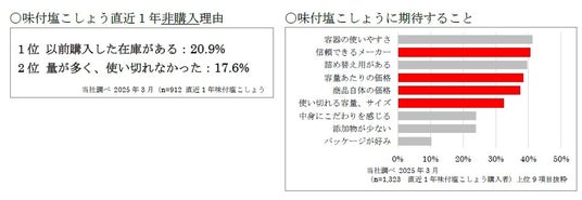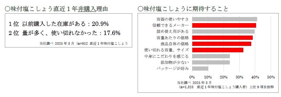 ・価格や容量に対するお客さまのニーズに着目味付塩こしょうの非購入理由として、「在庫がある」「使い切れなかった」という方が一定数いることが分かります。こうした背景から、味付塩こしょうには、メーカーの信頼性に加えて、コストパフォーマンスの良さや容量のバリエーションが求められています。