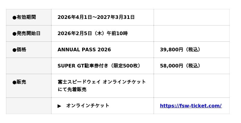富士スピードウェイは、シーズンを通して入場できる年間パス「ANNUAL PASS 2026」を、2月5日(木)午前10時より発売します。