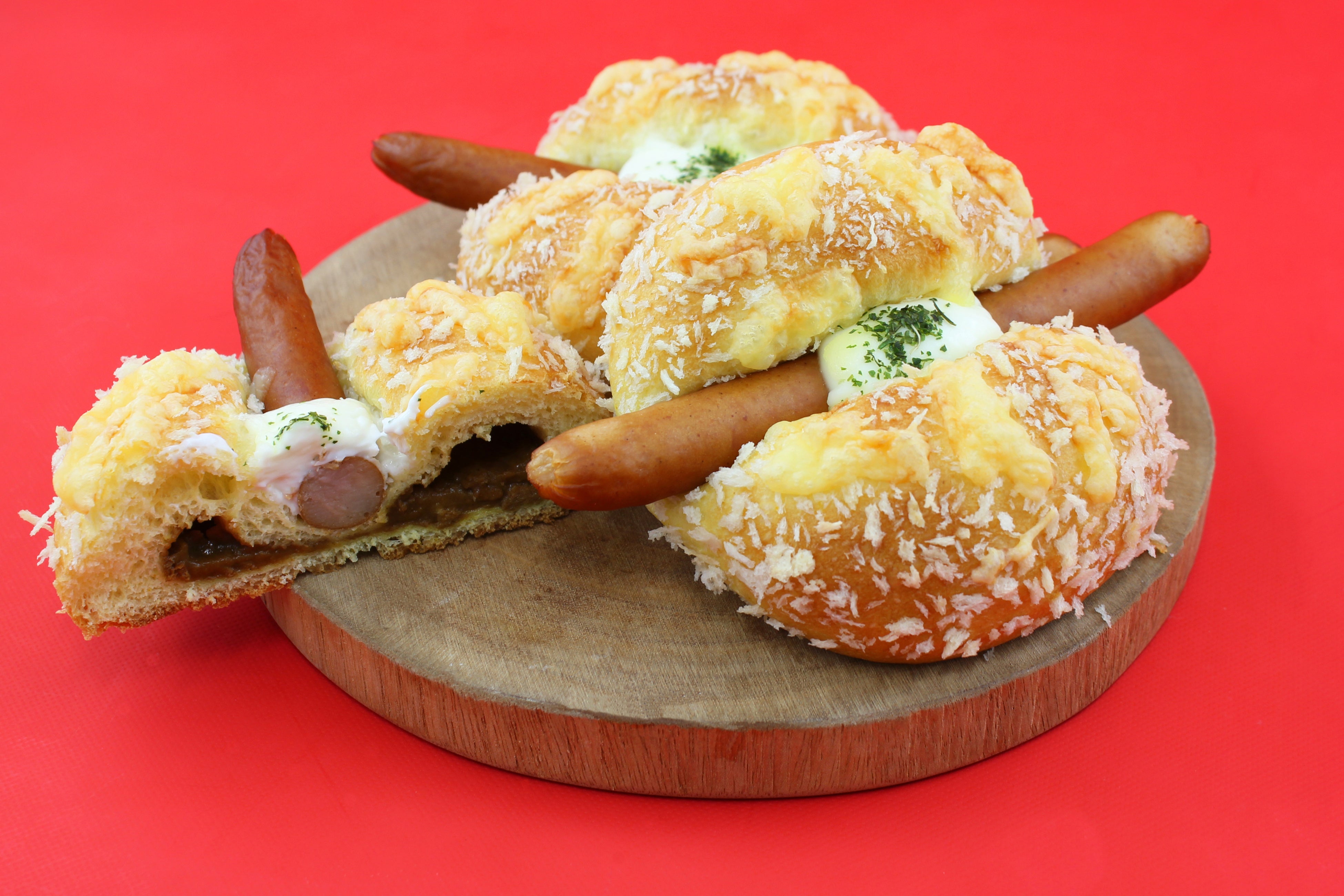 カレーを包んだ生地にウインナーとモッツァレラチーズソースをのせて焼き上げました。これで華麗(カレー)にWINNER!スパイシーなカレーと、旨み溢れるウインナーは、まさに無敵のコンビネーション!仕上げにのせたチーズソースのまろやかさが、美味しさをぐっと引き立てます。
