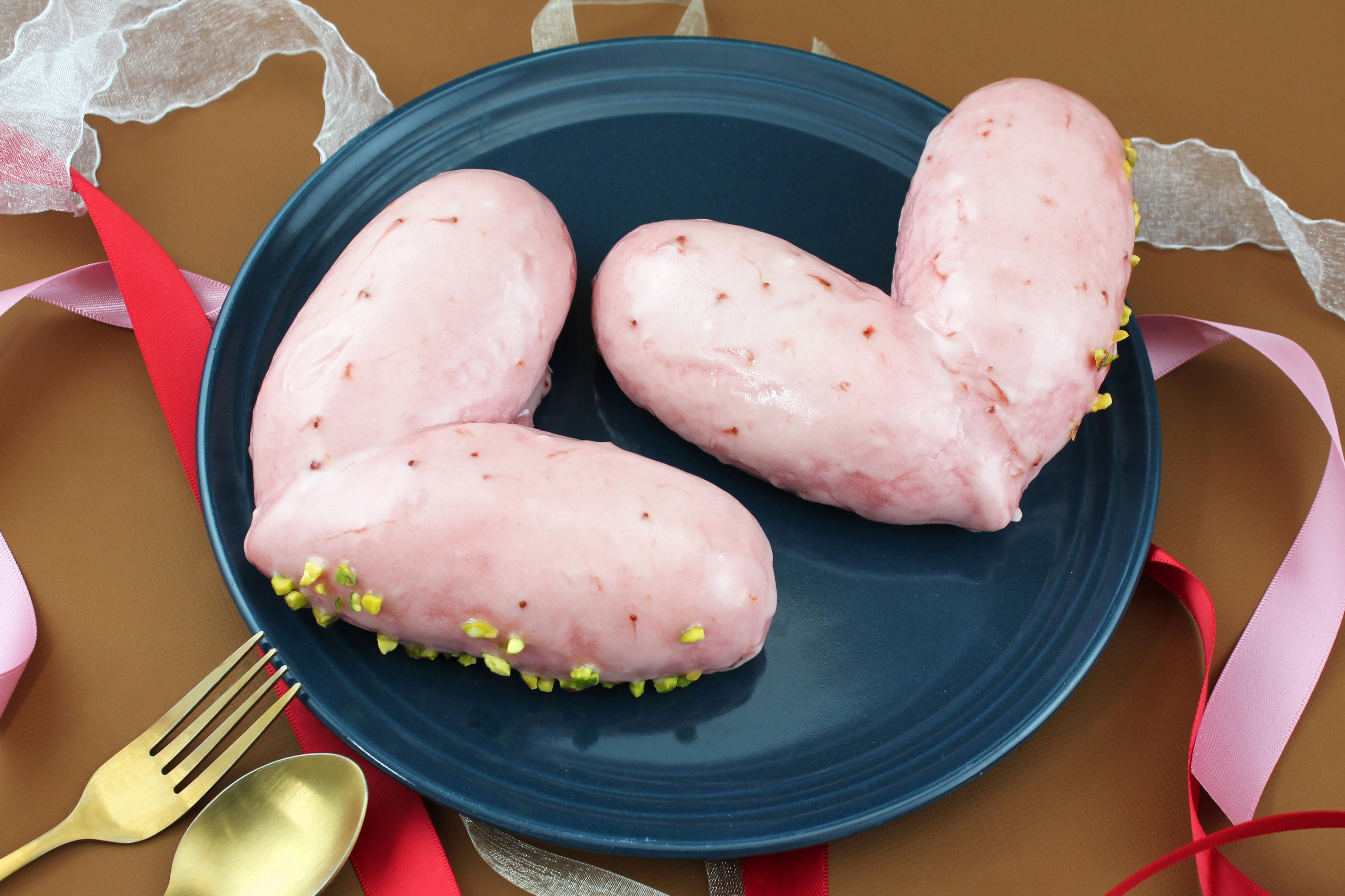 とちあいかピューレを練り込んだ生地に、いちごクリームを包み焼き上げました。見た瞬間にキュンとする、ピンクのハート形が目印! どこを食べてもいちごの甘~い香りが広がります。