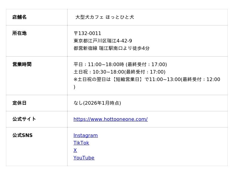 大型犬カフェ「ほっとひと犬」は、2024年9月に東京都江戸川区でオープンした大型犬カフェです。