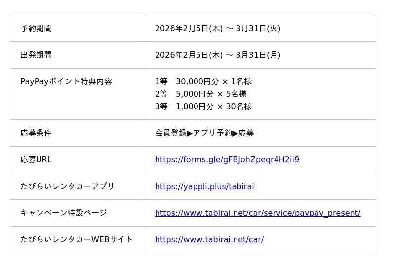 株式会社パム(本社:沖縄県那覇市、代表取締役社長:長嶺 由成)では、2026年2月5日(木)から3月31日(火)の期間中、「たびらいレンタカーアプリ」にてキャンペーンを実施いたします。期間中に会員登録の上、アプリからレンタカーを予約後、キャンペーンへ応募した方を対象に、抽選で36名様に最大3万円分のPayPayポイントをプレゼントいたします。